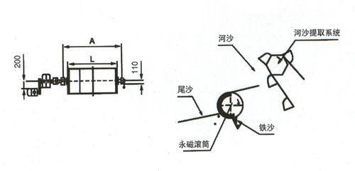 從河床提取的河沙加水后,進(jìn)入格篩,篩去粗大石塊后,進(jìn)入帶有勻礦板的槽體,再次經(jīng)加水稀釋、漂洗的沙漿均勻的給到滾筒表面具有高磁力的選別區(qū)。其中較高品位的鐵沙被高磁力吸附于筒體表面,并被旋轉(zhuǎn)的筒體輸送到下部的洗沙區(qū),經(jīng)沖洗水沖掉附帶的沙后被輸送到礦區(qū),由水流沖的鐵沙收集槽,成為高品位的鐵沙。而其中非槽性泥沙,則不受磁力作用直接進(jìn)入尾槽排出。由此達(dá)到提取鐵粉的目的。